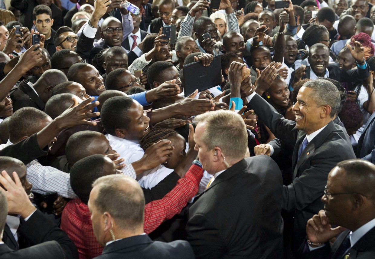 US President Barack Obama greets the crowd after speaking at Safaricom Indoor Arena in Nairobi on July 26, 2015. Obama arrived on July 24 in the Kenyan capital Nairobi, making his first visit to the country of his father's birth since his election as president. AFP PHOTO / SAUL LOEBSAUL LOEB/AFP/Getty ImagesSAUL LOEB / AFP - Getty Images