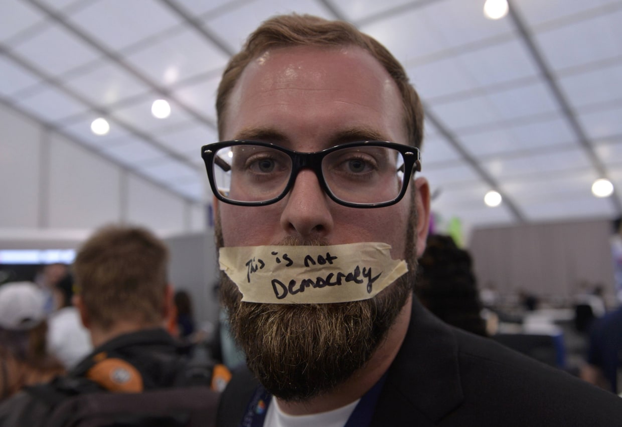 July 26, 201602:44“I didn’t know it would happen when the roll call voting began,” said Dennis Slotnick, an Ohio delegate who was one of several dozen that quietly occupied the press tent just outside the arena.