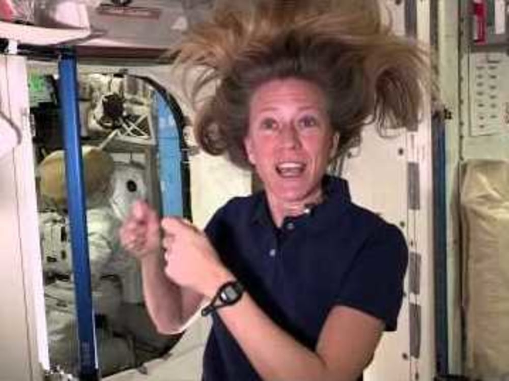 She then plucked one strand of hair, held it between her two hands and pressed it against a space station handrail. The slight force Nyberg applied sent her falling backward in slow motion, her white-socked feet rising as her head dipped down.