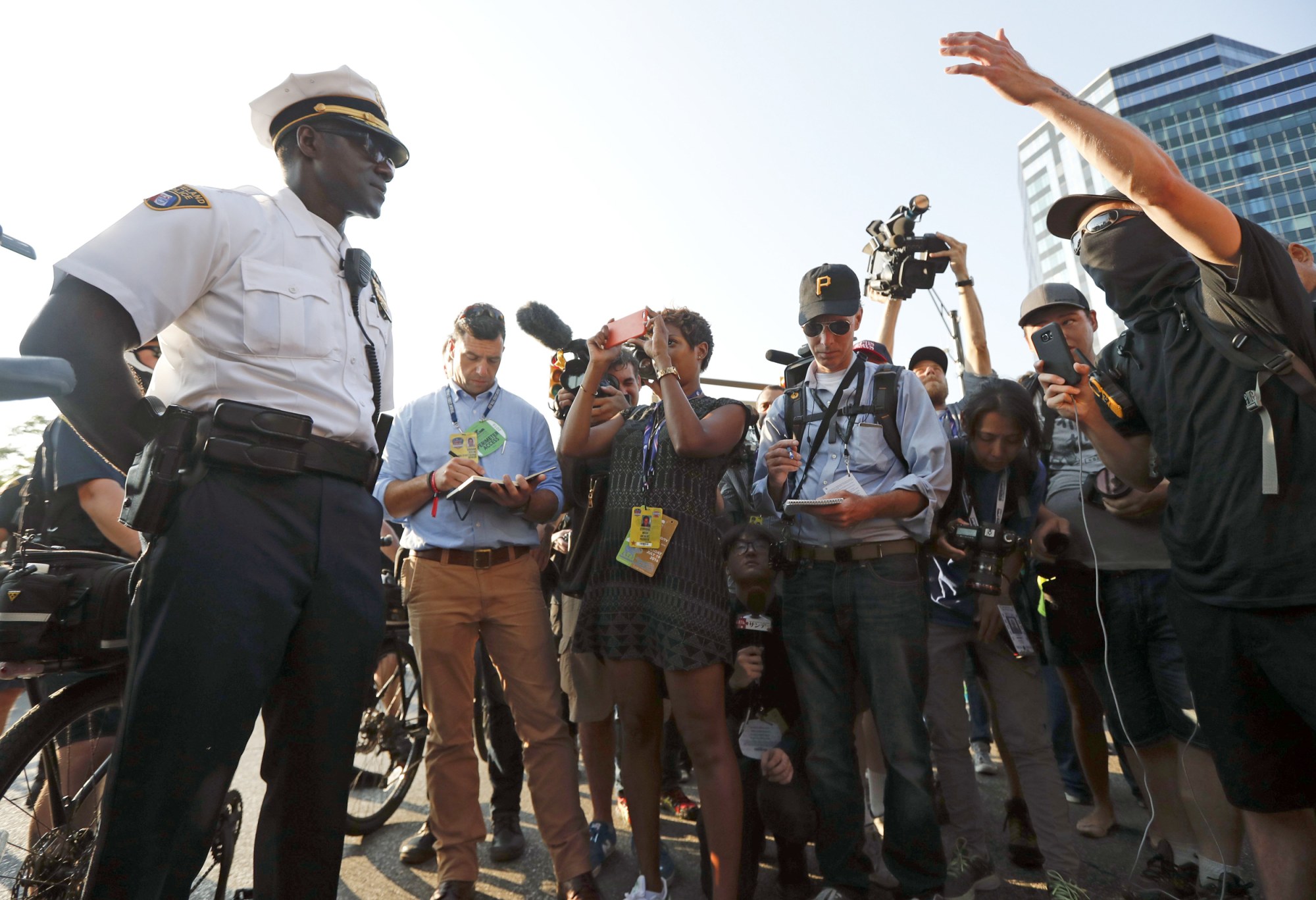 The incident unfolded at intersection of Prospect Avenue and East 4th Street, just beyond a security entrance for delegates walking into the Republican National Convention. Police, protesters, media and onlookers filled the street.