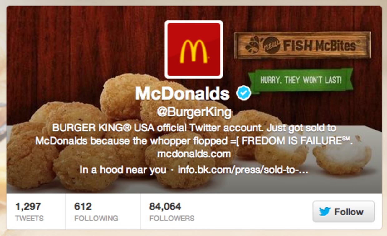 No matter. The Internet's getting a kick out of the whole incident. "The fact that @BurgerKing got hacked and turned into a @McDonalds feed is pretty funny," one Twitter user wrote. "Never know what is going to happen in social media."